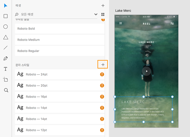 - 스타일을 에셋으로 추가하려면 스타일이 적용된 텍스트를 선택하고 에셋 패널의 문자 스타일 옆에 있는 + 아이콘을 클릭합니다. 여러 스타일로 텍스트를 선택하는 경우 + 아이콘을 클릭하여 여러 문자 스타일을 만듭니다.