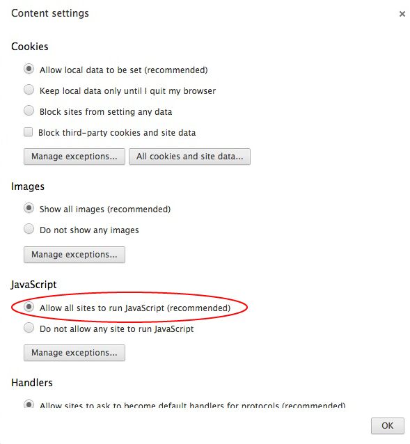 Compruebe que Permitir que todos los sitios ejecuten JavaScript esté seleccionado y haga clic en Aceptar.