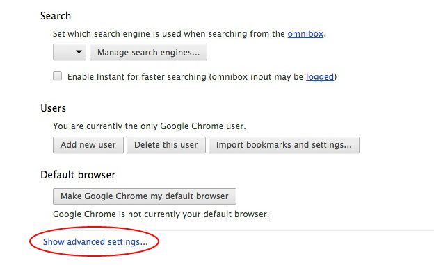 Desplácese a la parte inferior del cuadro de diálogo Configuración de Chrome; a continuación, haga clic en Mostrar configuración avanzada.