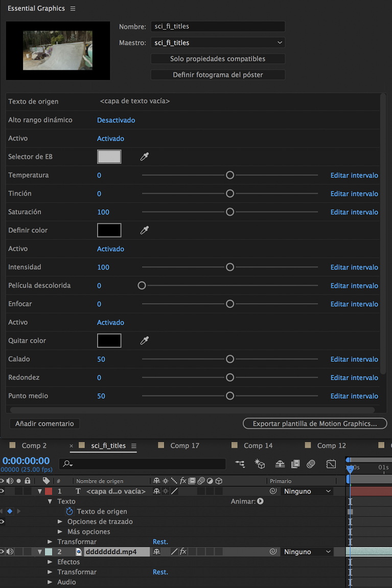 Para editar una plantilla de gráficos animados de After Effects (archivos .mogrt), puede abrirla como un proyecto en After Effects. Después de editar la plantilla, vuelva a exportarla como un archivo .mogrt.