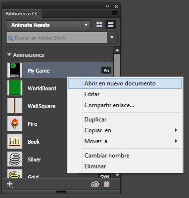 - Abrir en un nuevo documento: permite abrir la animación seleccionada como un nuevo documento. Como alternativa, también puede arrastrar y soltar la animación en el escenario.