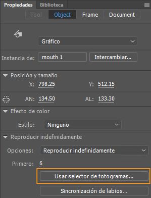 Seleccione un símbolo gráfico y, a continuación, vaya al botón Panel depropiedades > Reproducir indefinidamente > Usar selector de fotogramas... para mostrar el panel del selector de fotogramas, seleccione Ventana >Selector de fotogramas.