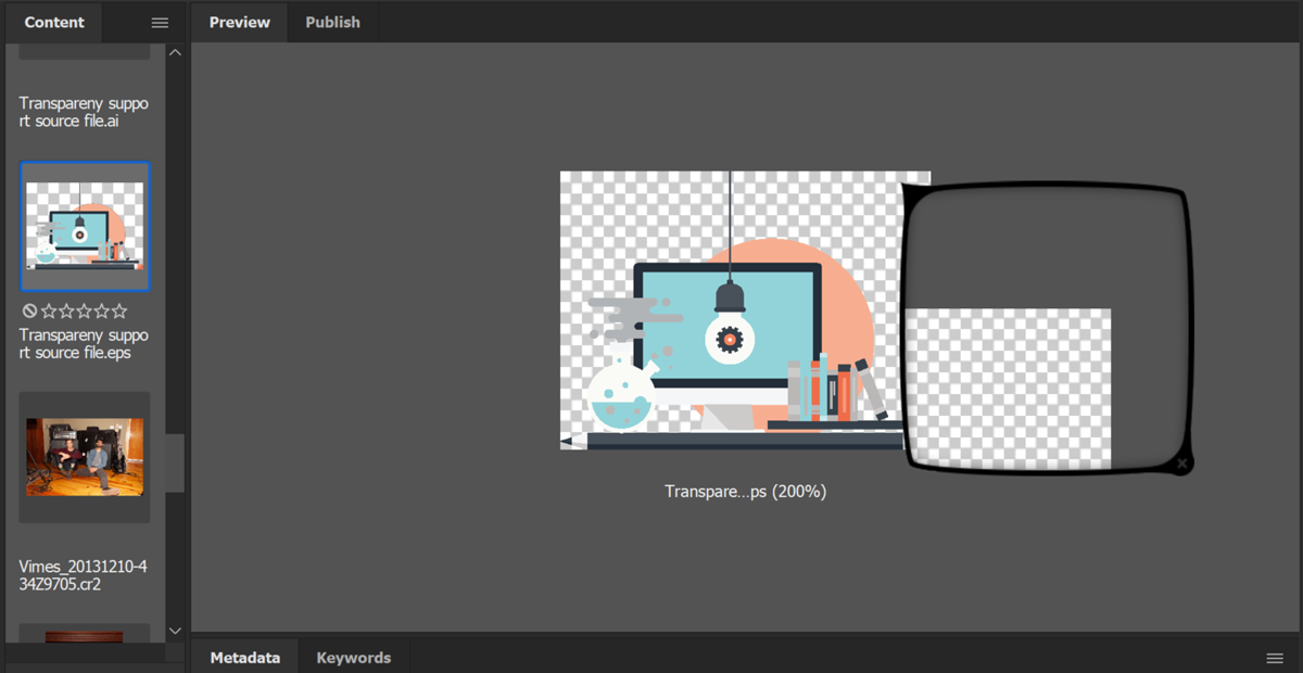 Con esta versión, Adobe Bridge ya es compatible con la transparencia. Puede ver las miniaturas de cuadrículas y las vistas previas de los formatos de archivos .AI y .EPS con transparencia. Anteriormente, la transparencia se sustituía por un fondo de color blanco mate.