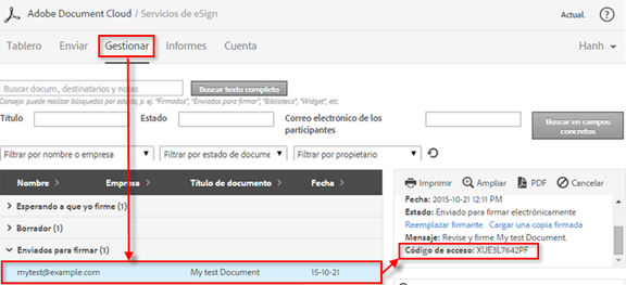 El firmante debe ir a http://www.echosign.com/esign e introducir el Código de acceso.