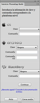si introduce información incorrecta, la build fallará y se mostrará un mensaje de error que indica que ha introducido una clave o contraseña incorrecta. Si no introduce ninguna información, la build de iOS fallará y se mostrará un mensaje de error que indica que se necesita la clave de firma. Las aplicaciones para Android y Blackberry se crean usando los certificados de depuración.