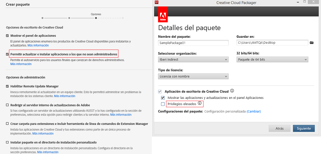 Los usuarios finales pueden o no tener privilegios administrativos aplicables al sistema operativo en sus ordenadores. De este modo, aunque seleccione Habilitar la instalación en autoservicio, es posible que no puedan instalar ni actualizar aplicaciones en sus equipos. Si selecciona Permitir actualizar e instalar aplicaciones a los que no sean administradores, permitirá que los usuarios finales puedan instalar y actualizar aplicaciones aunque no tengan privilegios de administrador en sus ordenadores.