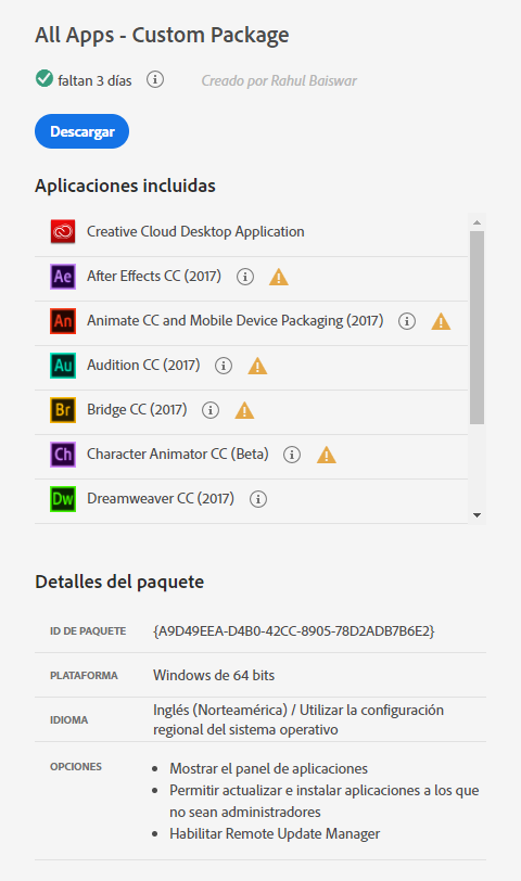 Puede ver, seguir y eliminar los paquetes que tanto usted como el resto de administradores hayan creado para la misma organización. También puede seguir las actualizaciones de las versiones de las aplicaciones en un determinado paquete y planear la implementación de esas actualizaciones en consonancia.