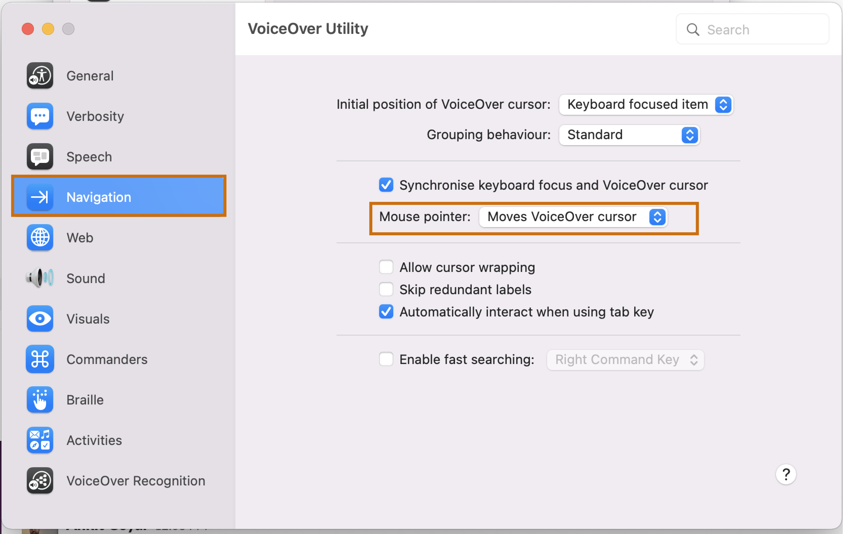4. En la ventana Utilidad VoiceOver, seleccione Navegación en el panel izquierdo y, a continuación, en el menú desplegable Puntero del ratón, seleccione Mueve el cursor de VoiceOver.