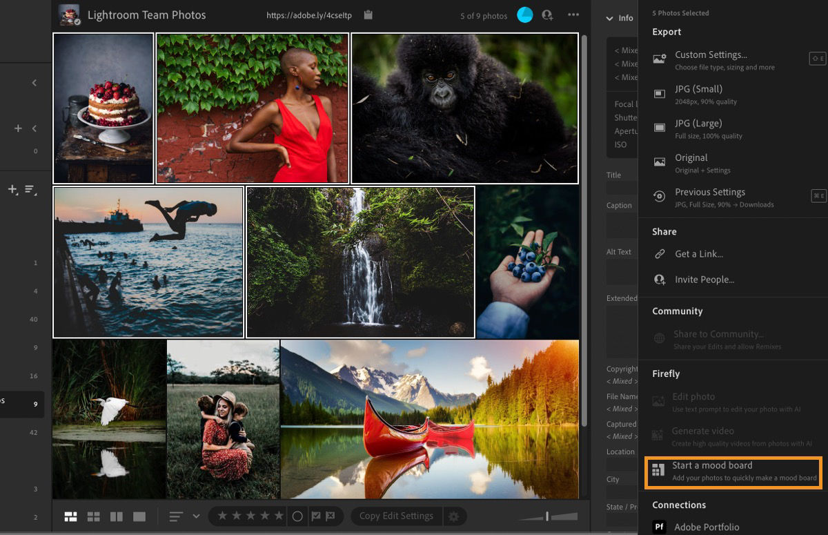 Creating mood boards is now easier with Firefly. Quickly select and share Lightroom photos to Firefly boards and ideate or create mood boards. You can select and share up to 10 photos at a time.