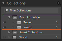 Previously synced Lightroom Photos and collections in Lightroom for mobile. Previously synced Lightroom Photos and collections in Lightroom for mobile. Catalog panel in Lightroom desktop; all the synced photos in the 'Lightroom Photos' view in Lightroom for mobile (left) are added to 'All Synced Photographs' in the Catalog panel. Catalog panel in Lightroom desktop; all the synced photos in the 'Lightroom Photos' view in Lightroom for mobile (left) are added to 'All Synced Photographs' in the Catalog panel. Collections panel in Lightroom desktop; all the synced collections are downloaded under 'From Lightroom mobile' collection set in the Collections panel. Collections panel in Lightroom desktop; all the synced collections are downloaded under 'From Lightroom mobile' collection set in the Collections panel. - All the synced collections are downloaded under From Lightroom mobile collection set in the Collections panel.