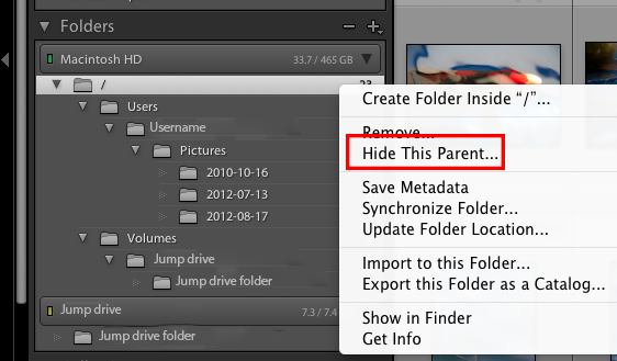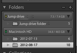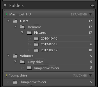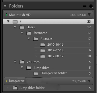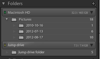 Move to another location all the images that you imported from the root of the Macintosh HD using Add. If necessary, use a Finder window to locate these photos. After you import them using Add, they are no longer listed in the Folders panel. You can move them in Finder, and then relink to them. The image below shows what the Folders panel looks like after you import an image from the root of your Macintosh HD using the Add option.