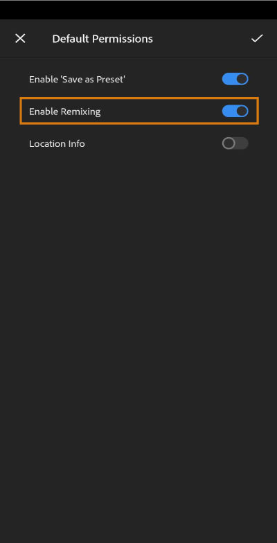 Select Enable Save as Preset to allow other users to save your edits as preset. This option is enabled by default. Select Include location Info to share your location info along with the edits.