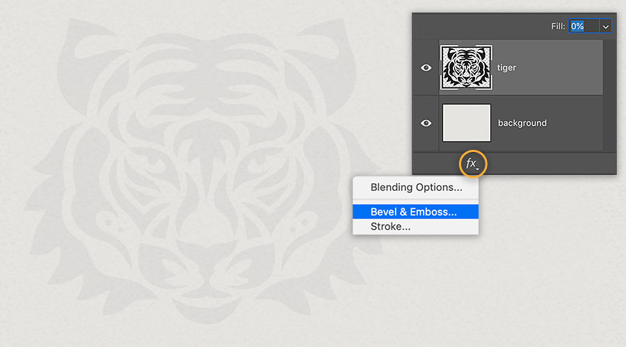 The emboss effect is a layer style, so Lukianova clicked the ‘fx’ icon in the Layers panel and chose Bevel & Emboss. You can also double-click a layer to open the Layer Style dialog box.