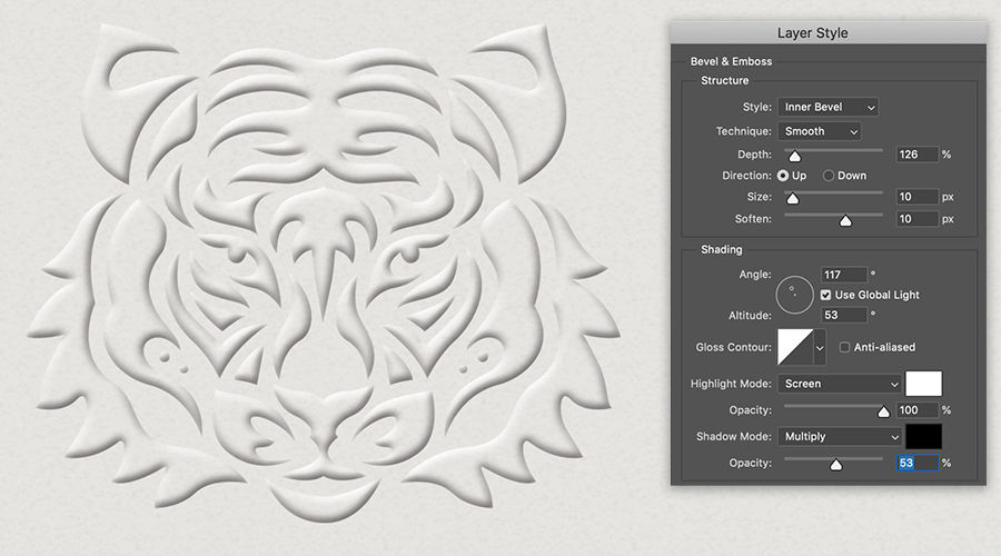 Lukianova experimented with the Bevel & Emboss settings until she was happy with the results. See the screenshot below for the adjustments she made.