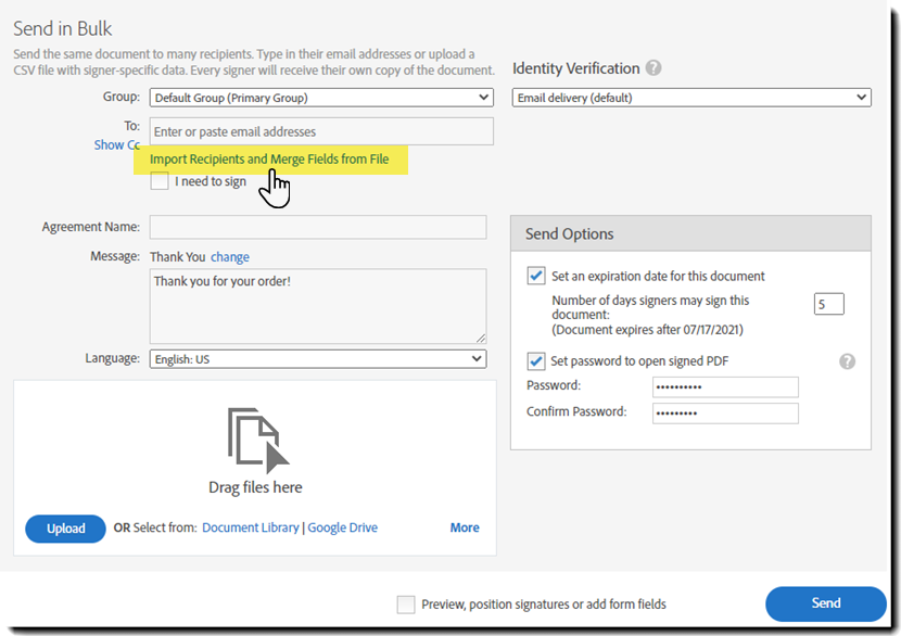 • The Send in Bulk template allows the configuration of many agreement options, and if the CSV does not explicitly define a setting, the default value from the parent template is used. So if all agreements have the same Agreement name, don't include that column in your CSV file.