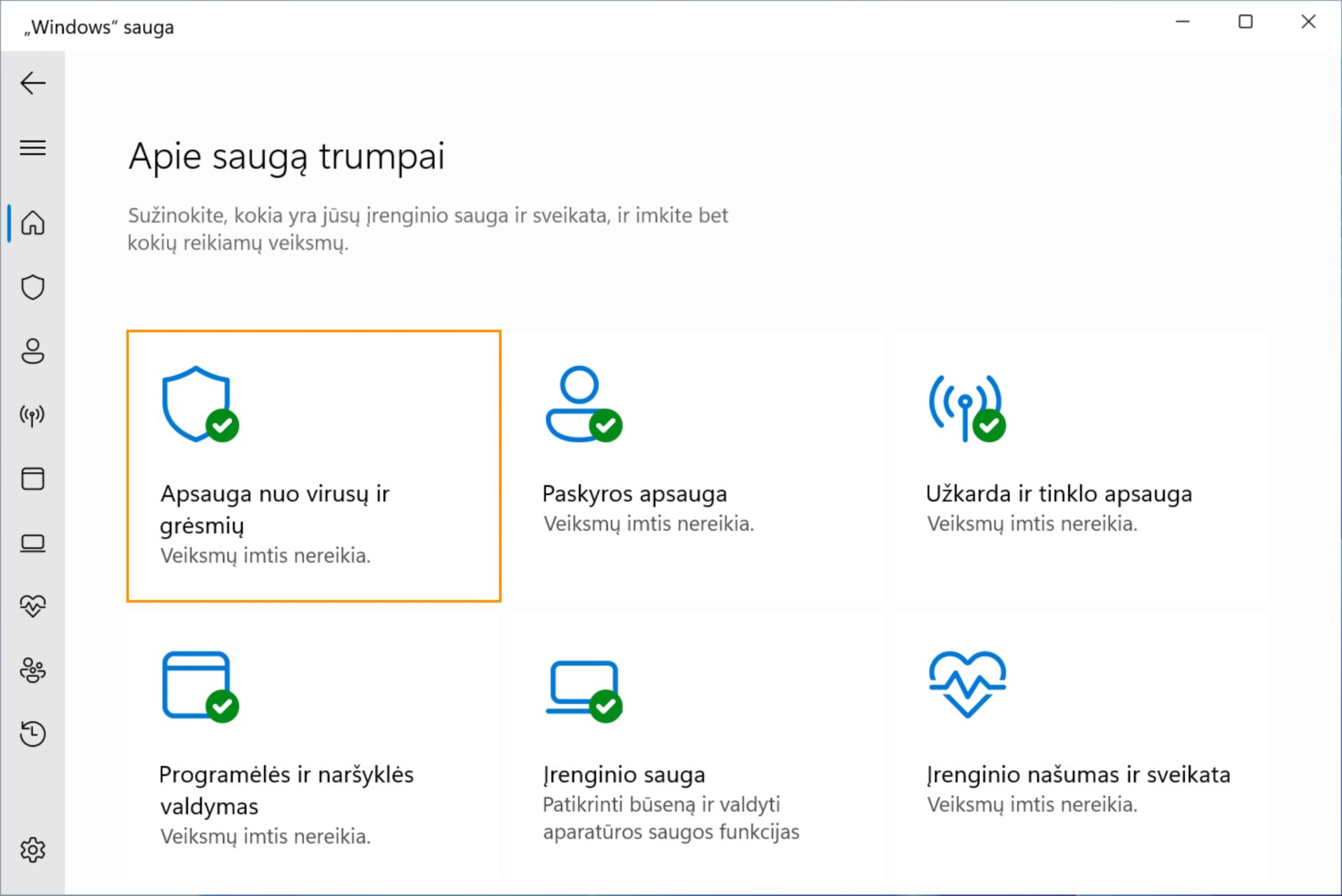 Taip pat galite pasirinkti Pradžia > Parametrai > Naujinimas & Saugos > Apsauga nuo virusų ir grėsmių.