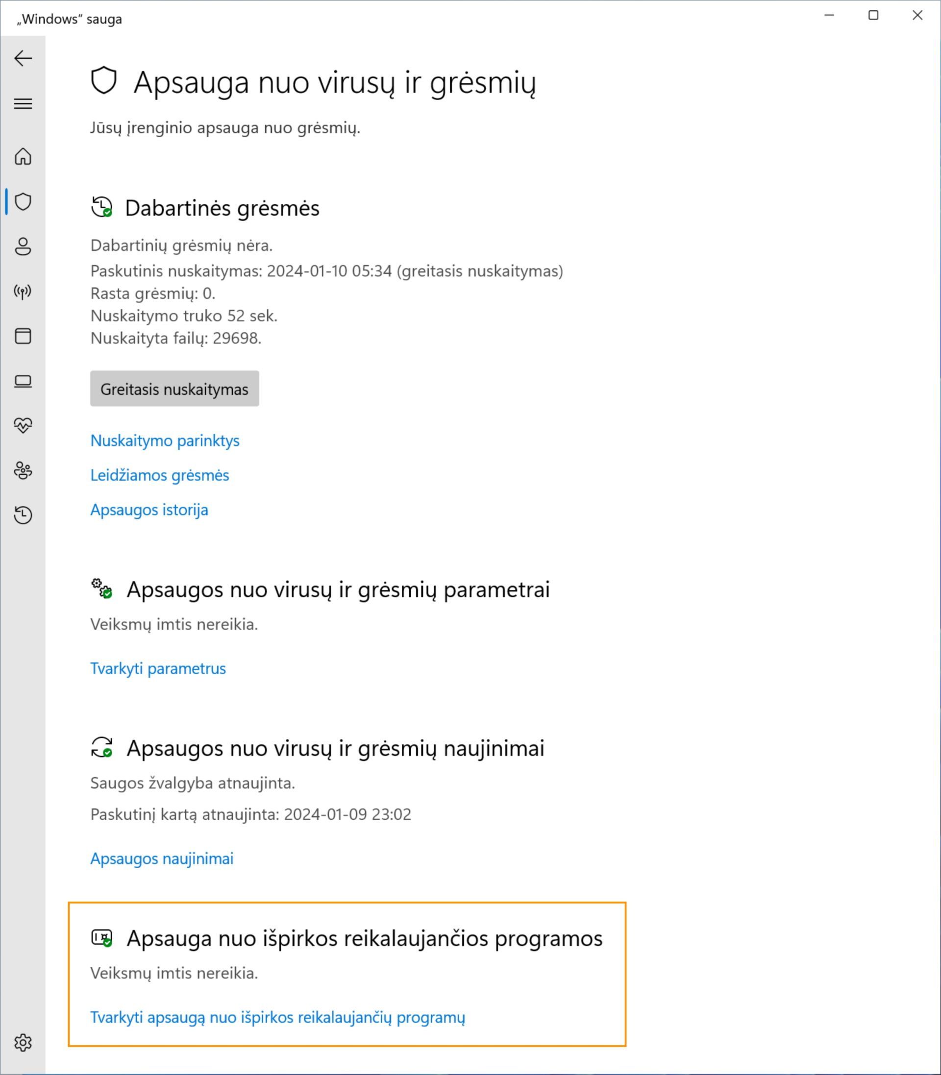Skirsnio Apsauga nuo virusų ir grėsmių nustatymuose pasirinkite Apsauga nuo išpirkos reikalaujančios programos.