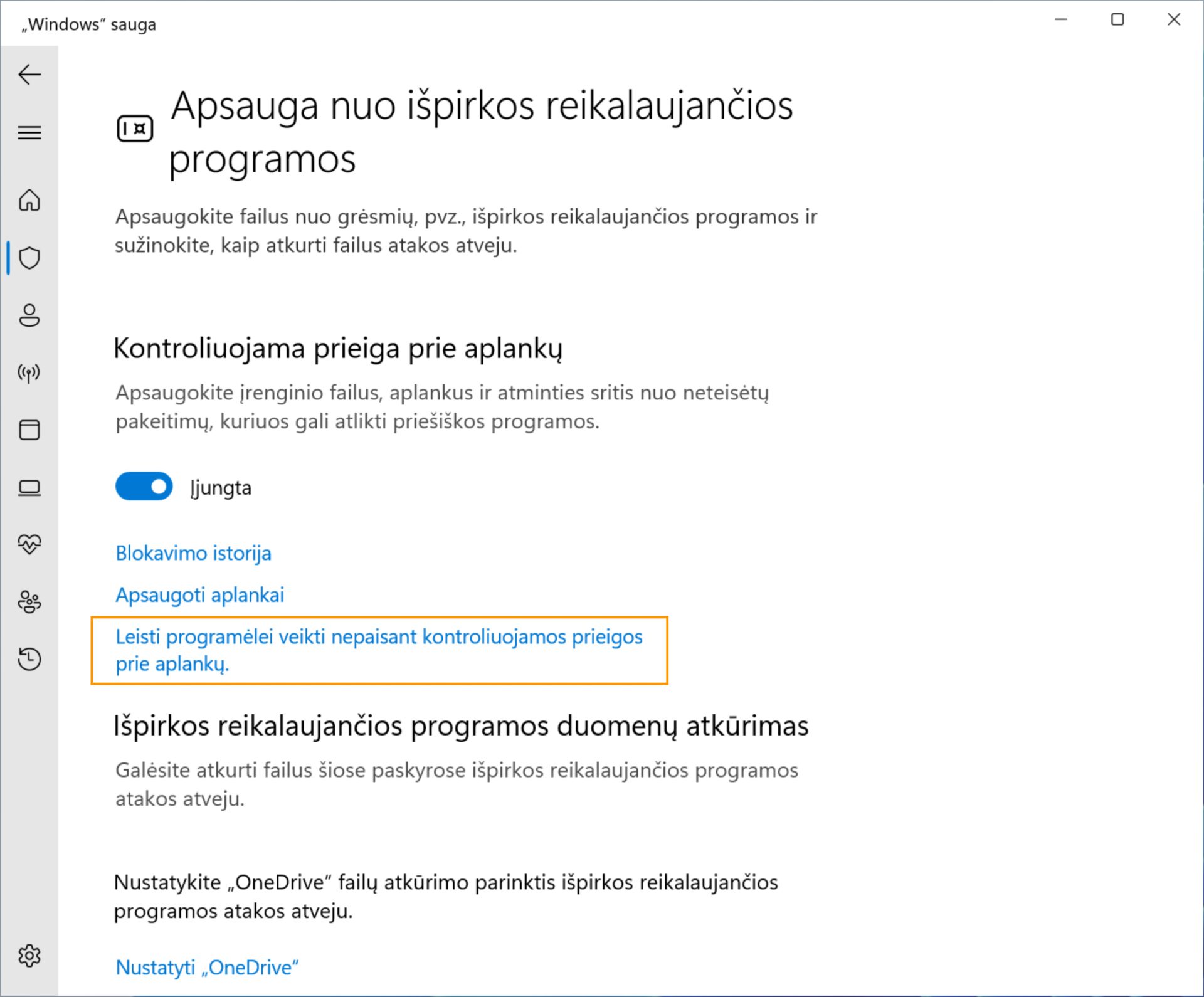 Pasirinkite parinktį Leisti programėlei veikti nepaisant kontroliuojamos prieigos prie aplankų.