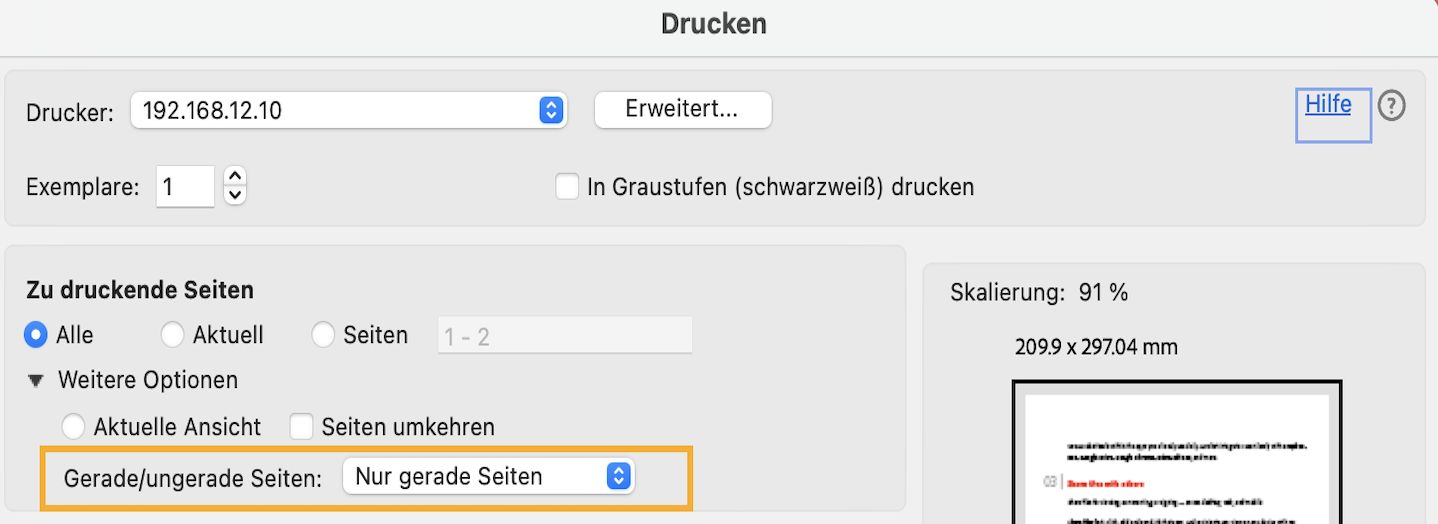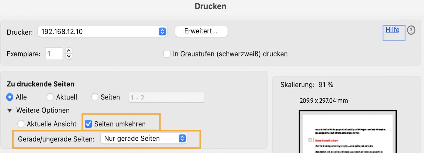 Wähle im Dialogfeld „Drucken“ im Abschnitt „Zu druckende Seiten“ Seiten umkehren und Nur gerade Seiten. Mit dieser Option wird sichergestellt, dass die Seitenreihenfolge korrekt ist.