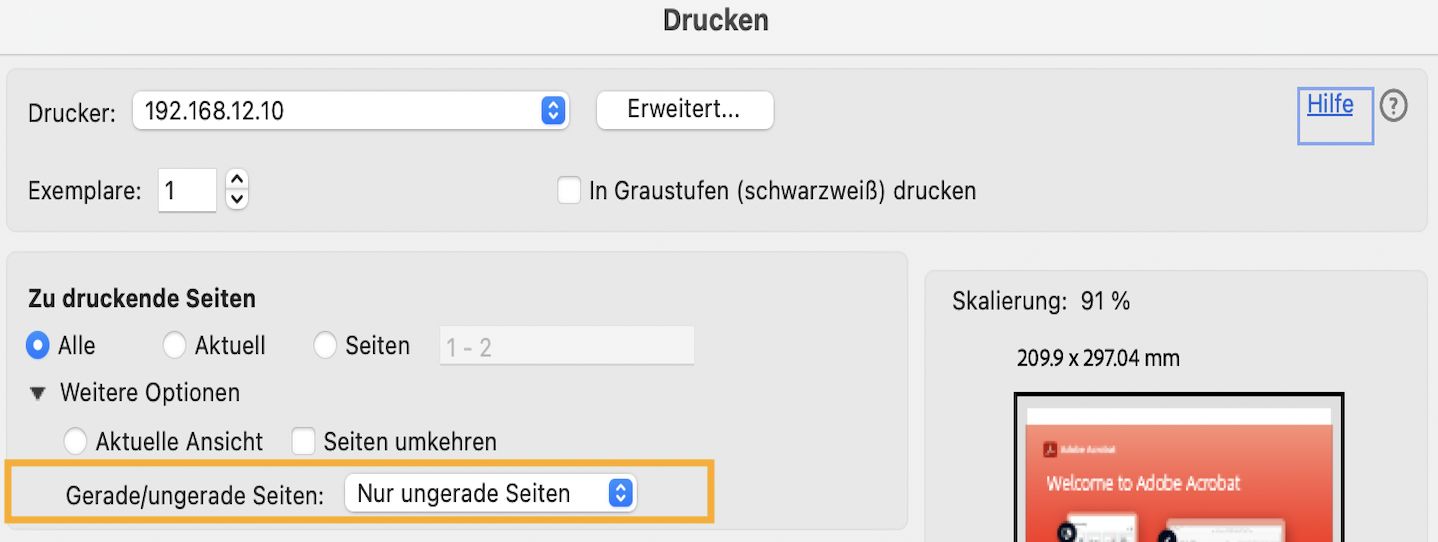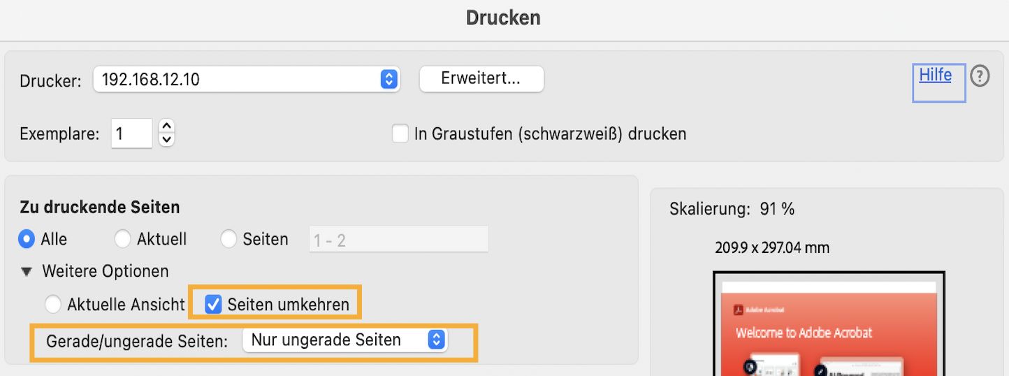 Wähle im Dialogfeld „Drucken“ im Abschnitt „Zu druckende Seiten“ Seiten umkehren und Nur ungerade Seiten. Mit dieser Option wird sichergestellt, dass die Seitenreihenfolge korrekt ist.