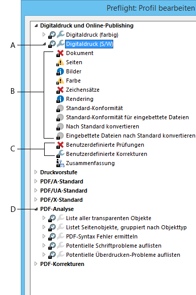 Im Dialogfeld Bearbeiten der Profile von Preflight werden alle verfügbaren Profile aufgeführt. Außerdem wird angezeigt, welche Dokumenteigenschaften analysiert werden. In diesem Dialogfeld kannst du ein Profil freigeben und sperren, eine neue Gruppe zum Organisieren von Profilen erstellen und Prüfkriterien festlegen. Durch Erweitern deines Profils kannst du auf zusätzliche Optionen und Informationen zugreifen.