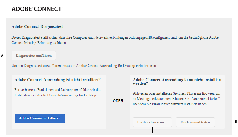 Um den Test vor dem Meeting verwenden zu können, benötigen Sie eine Adobe Connect-Desktop-Anwendung. Wenn keines von beiden installiert ist, wird auf der Seite für den Test vor dem Meeting das Dialogfeld “Adobe Connect-Diagnosetest“ angezeigt.