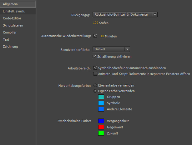 in der Titelleiste von Animate klicken und Einstellungen jetzt synchronisieren wählen. - Um die Einstellungen für die Synchronisierung zu ändern, wählen Sie Bearbeiten > Voreinstellungen > Einstellungen synchronisieren. Sie können auf Einstellungen jetzt synchronisieren klicken, um die geänderten Einstellungen mit Creative Cloud zu synchronisieren.