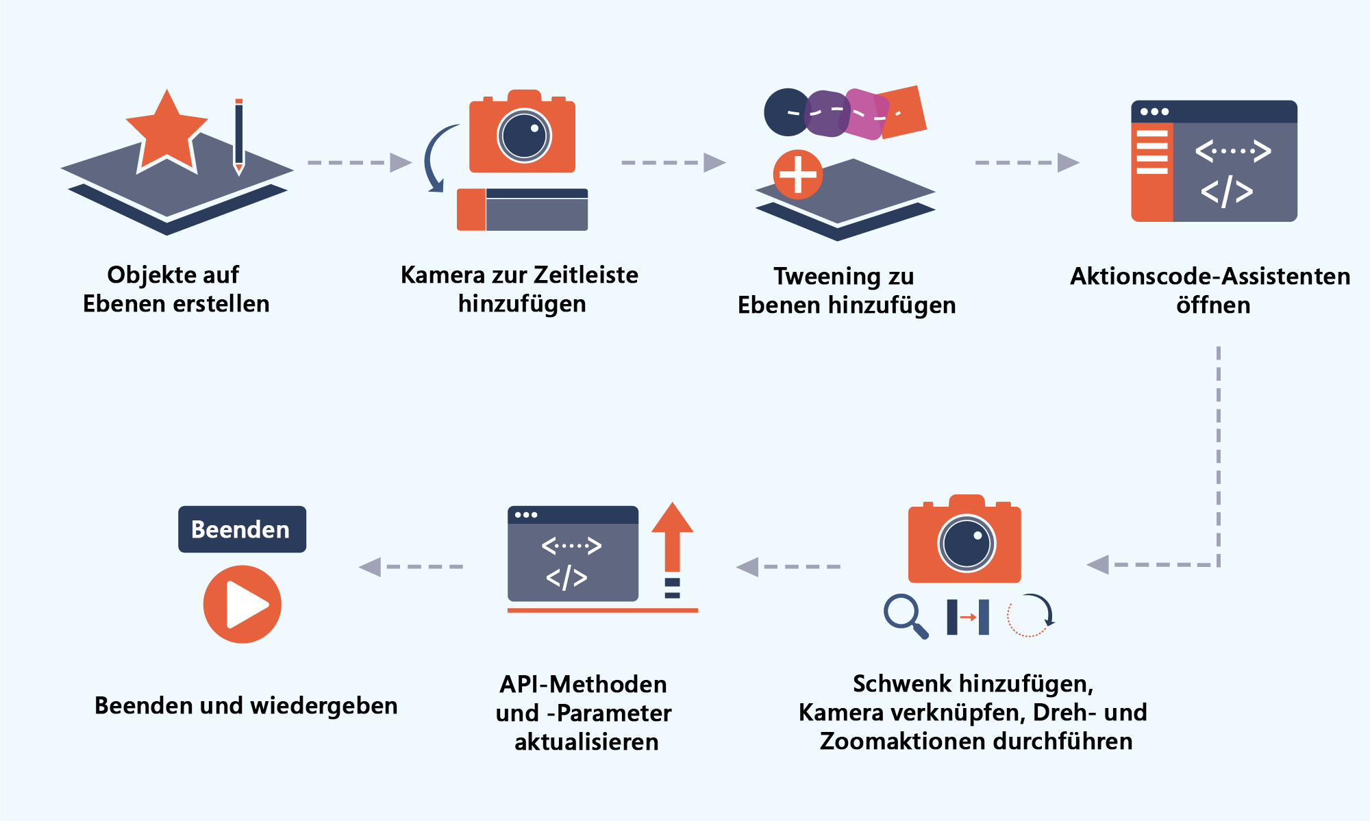 Die detaillierte Vorgehensweise für das Erstellen von Animationen mit einer interaktiven Kamera wird im folgenden Diagramm dargestellt. Sie können den Aktionscode-Assistenten in HTML Canvas-Dokumenten verwenden.