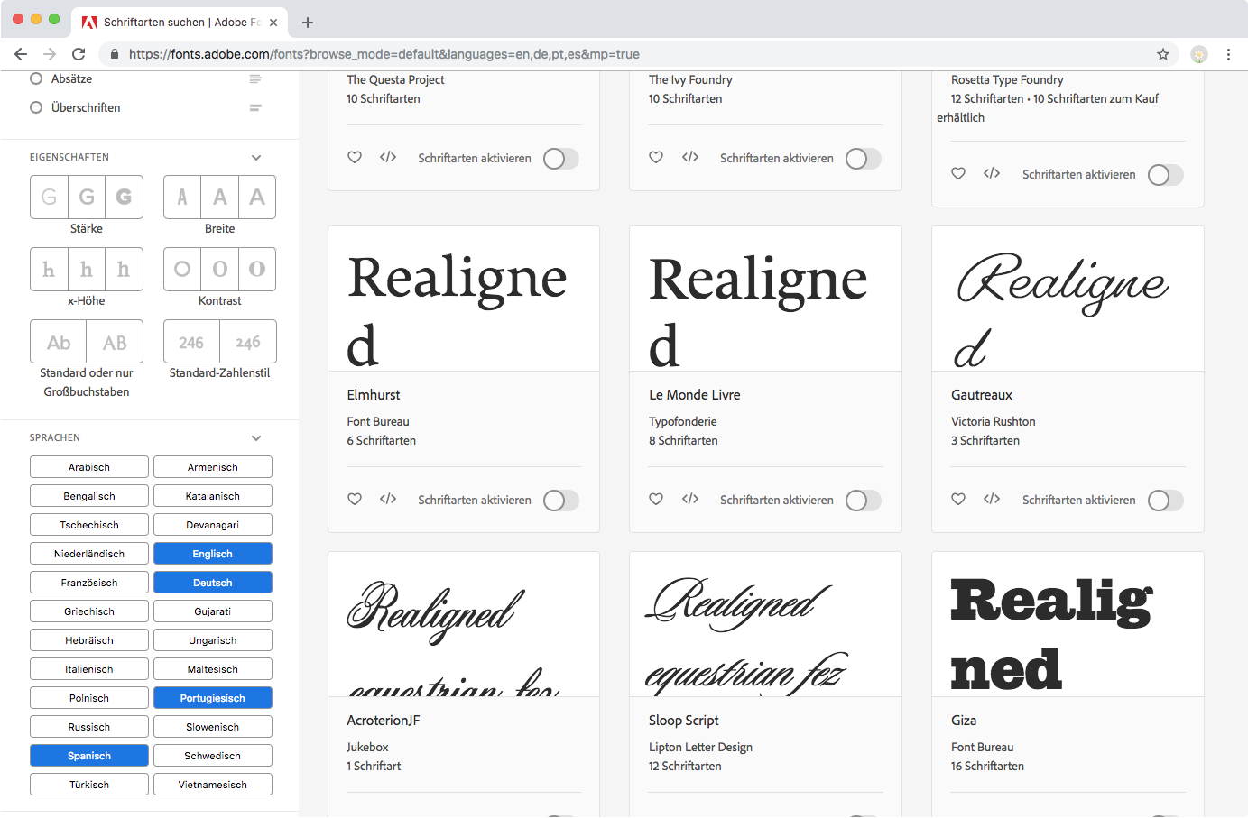 Sprachunterstützung auf der Seite einer Schriftfamilie