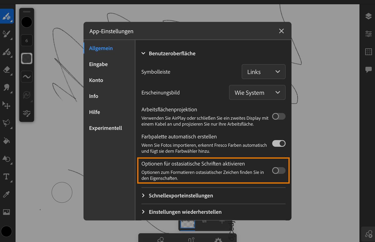 Schalte Optionen für ostasiatische Schriften aktivieren ein, um ostasiatische Schriftzeichen zu aktivieren.
