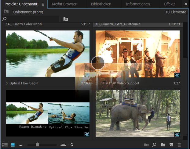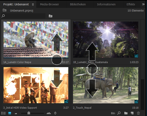 Mit zwei Fingern und einer Geste wie der Bildlaufgeste kannst du Clips und Sequenzen in der Symbolansicht des Bedienfelds Projekt und in den Bedienfeldern des Programmonitors wie beim Hover Scrubbing vorwärts oder rückwärts scrubben. Mit der Scrubbing-Geste wird der Abspielkopf im Clip/in der Sequenz mit einer 1:1-Beziehung basierend auf der Breite der Miniatur/des Monitors über eine Dauer von bis zu 30 Minuten bewegt. Für die jeweils nächsten 30 Minuten ist eine weitere Scrubbing-Geste erforderlich. Der Abspielkopf bleibt am Ende jeder Geste an der Position, an der er angehalten wurde.