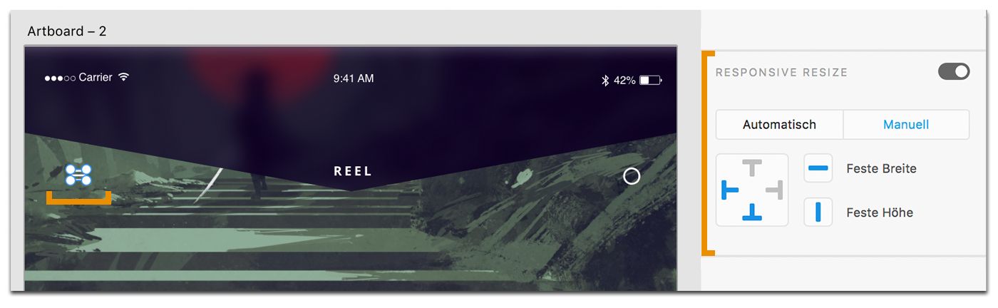 Mit Responsive Resize prognostiziert XD, welche Bedingungen Sie wahrscheinlich anwenden werden, und wendet diese Bedingungen beim Skalieren von Objekten automatisch an.