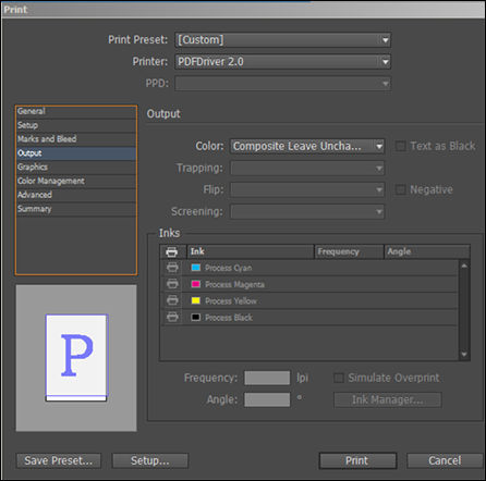 In general, print quality from applications through PDF Driver is equivalent to (or better than) PostScript printing. PDF printing through the Adobe PDF printer also supports live transparency and ICC color management. At InDesign print dialog, options related to Color Management, Color Separation, and Graphics options are disabled because all the color management operations are done on the device for better quality printout.