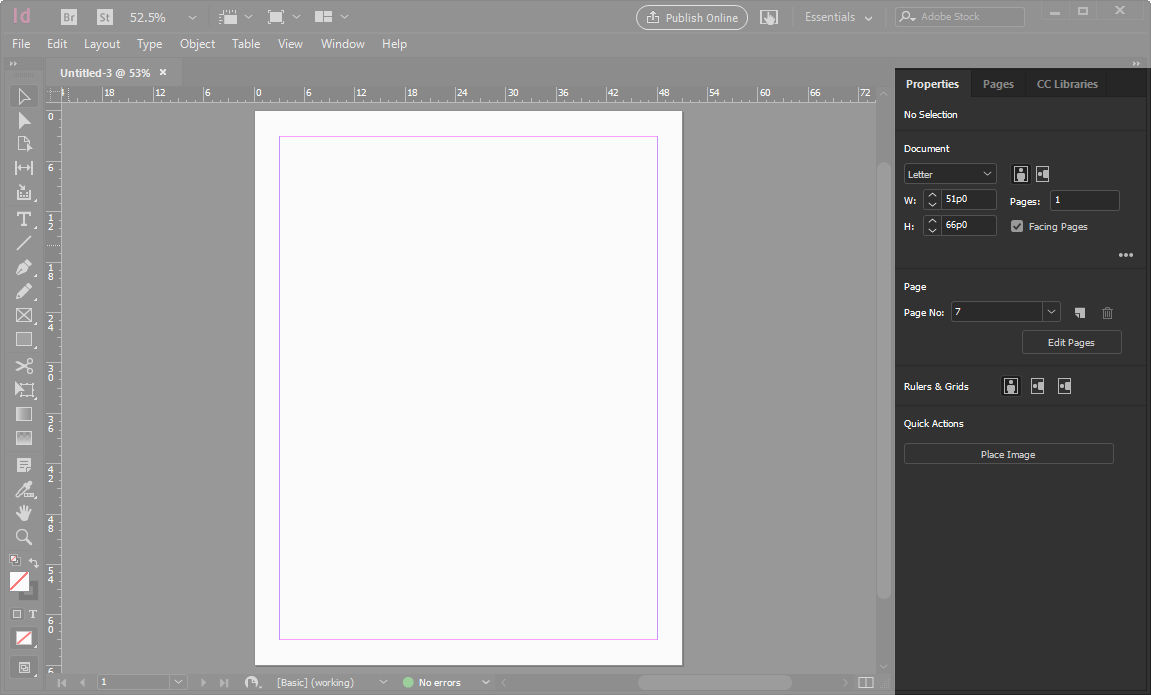 When no objects are selected in your document and the Selection tool is selected, the Properties panel displays controls related to the page, ruler, grids, guides, snapping, and some commonly used preferences. In this state, the Properties panel displays quick action button that lets you place an image in the document.