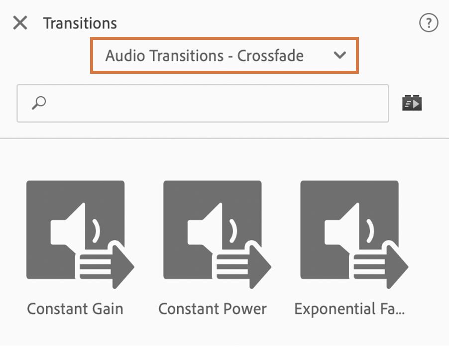 - Constant Gain - Applies a linear fade between two audio clips. It changes volume at a constant rate, which can sometimes sound abrupt. Existing audio transition which can also be used for 360 and VR media.