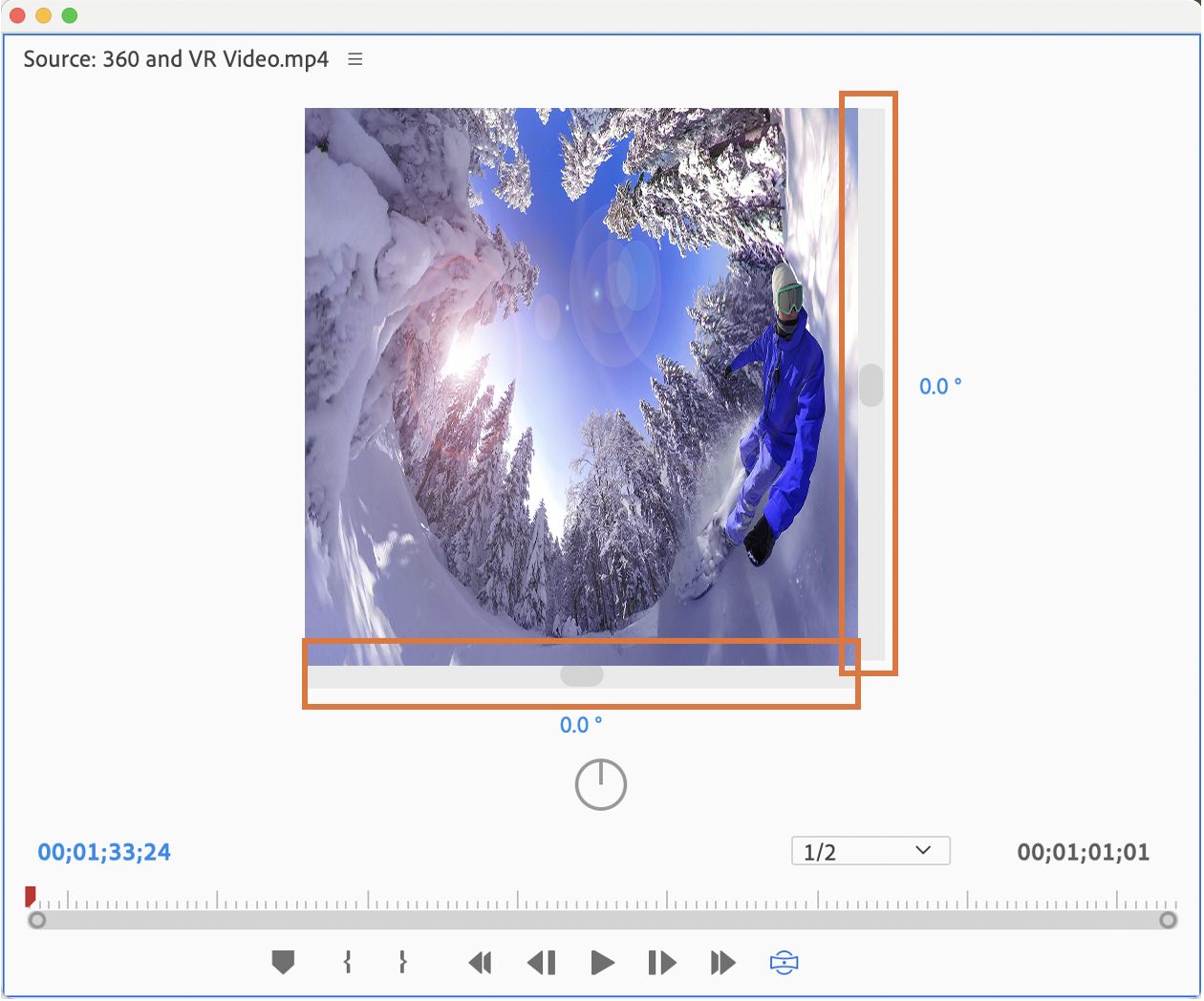 In the Source and Program Monitors, the VR view lets you adjust pan and tilt using scroll bars, hot-text controls, or a dial for continuous panning. You can also hide these controls if you prefer a larger viewing area.