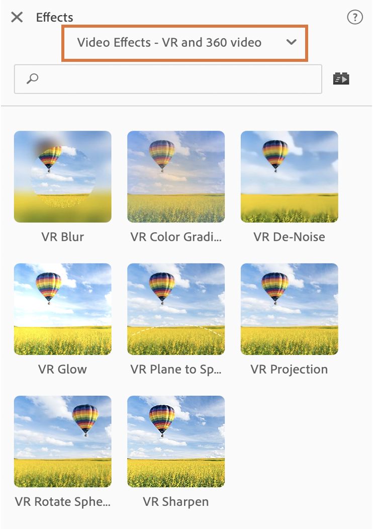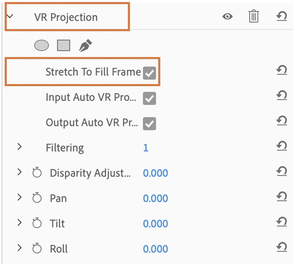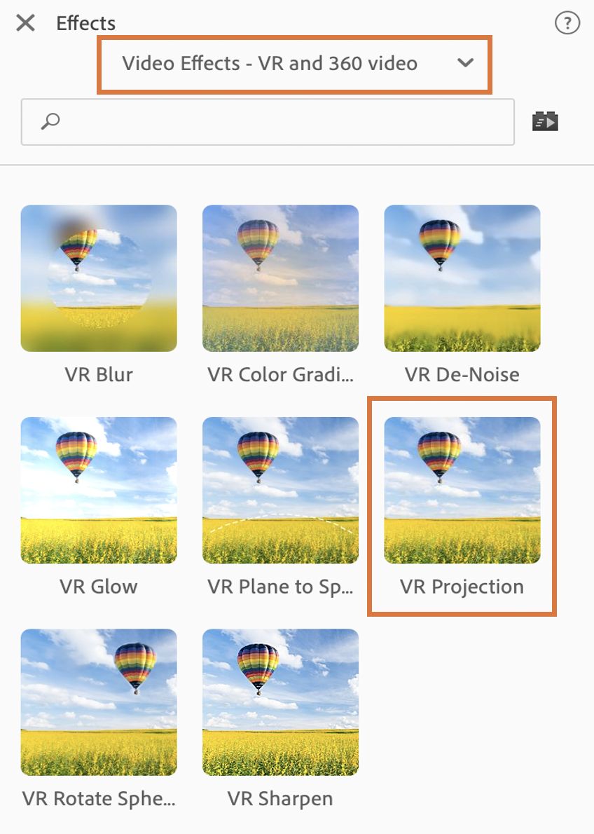 Select Effects > VR Projection effect to the video clip in the sequence. This effect allows you to reorient the video sphere.