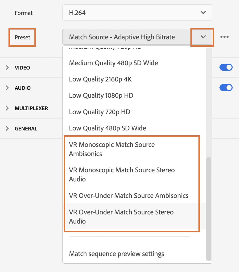 To include Ambisonics audio in your export, go to the Preset dropdown in the Export & Share panel and select any Match Source Ambisonics.