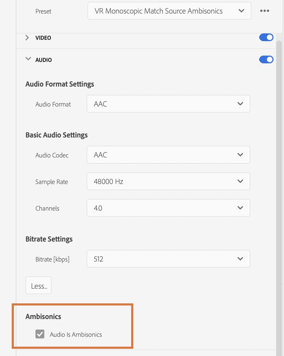 Click More, then under Ambisonics, select the checkbox and enable to add Ambisonics Audio Metadata.
