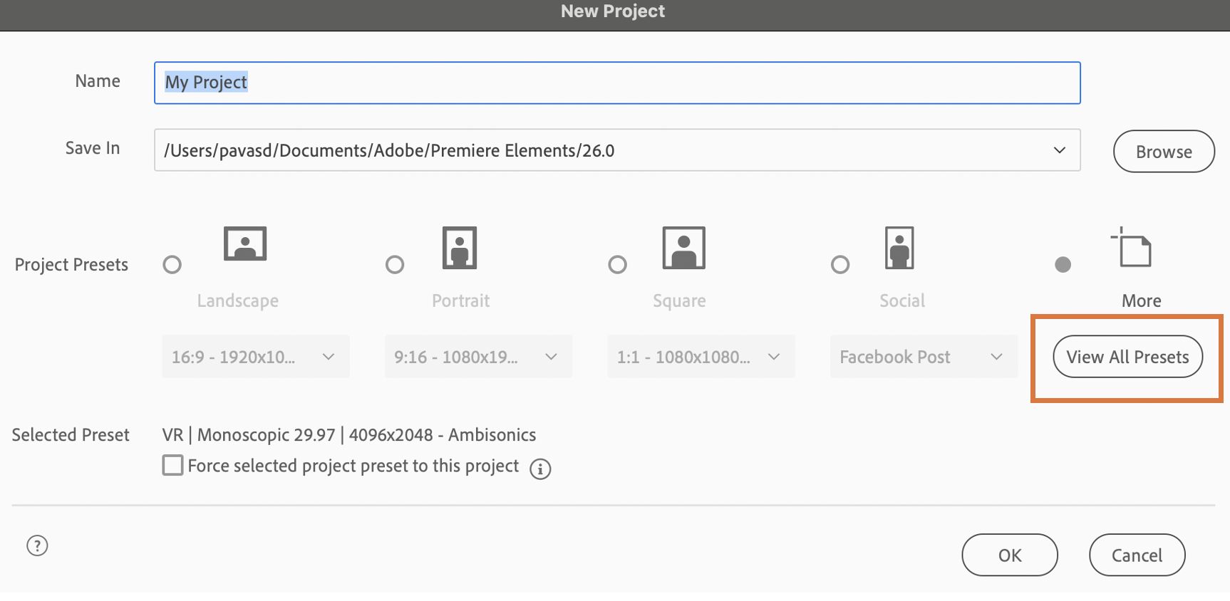 - In the New Project dialog, click View All Presets to expand the available preset categories.