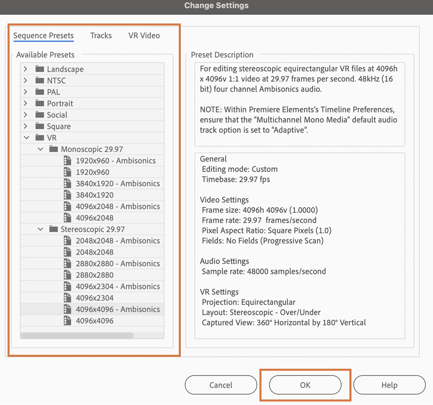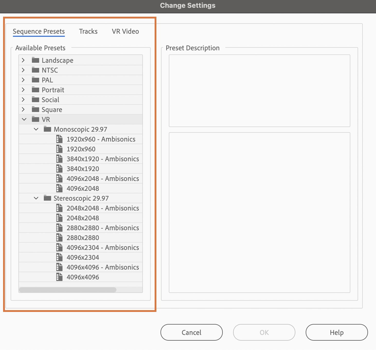 In the Change Settings dialog box, go to Sequence Presets and choose VR.