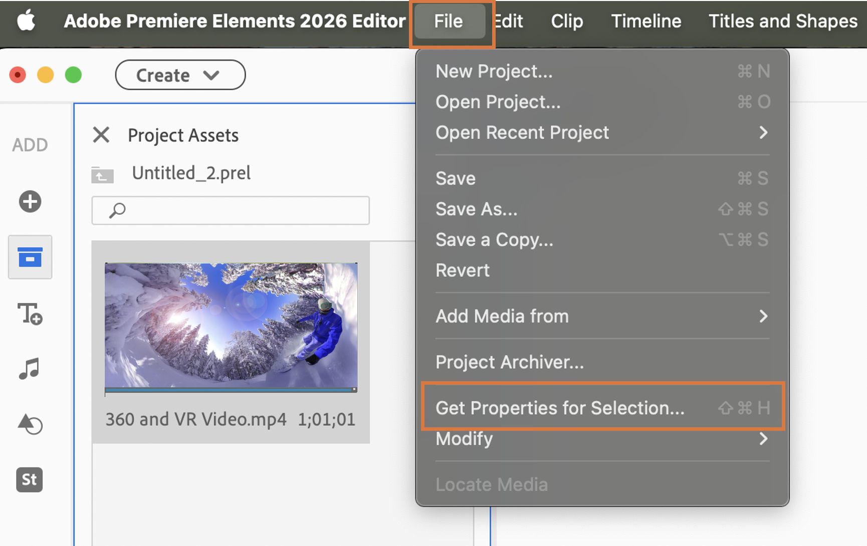 Premiere Elements requires pre-stitched footage to ensure compatibility. After importing the media into Project Assets, right-click the clip and choose Properties to review metadata. Confirm that the Projection is set to Equirectangular, Layout is Monoscopic (or Stereoscopic), and that the Field of View is 360° horizontal by 180° vertical. These properties ensure the footage is recognized correctly and that immersive features work as intended.