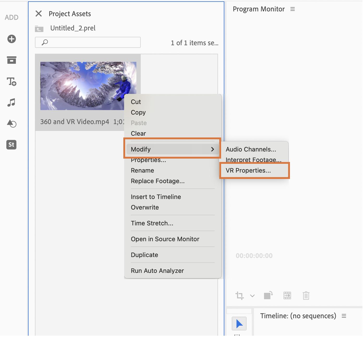 Right-click the clip in the Project Assets panel and choose Modify > VR Properties.