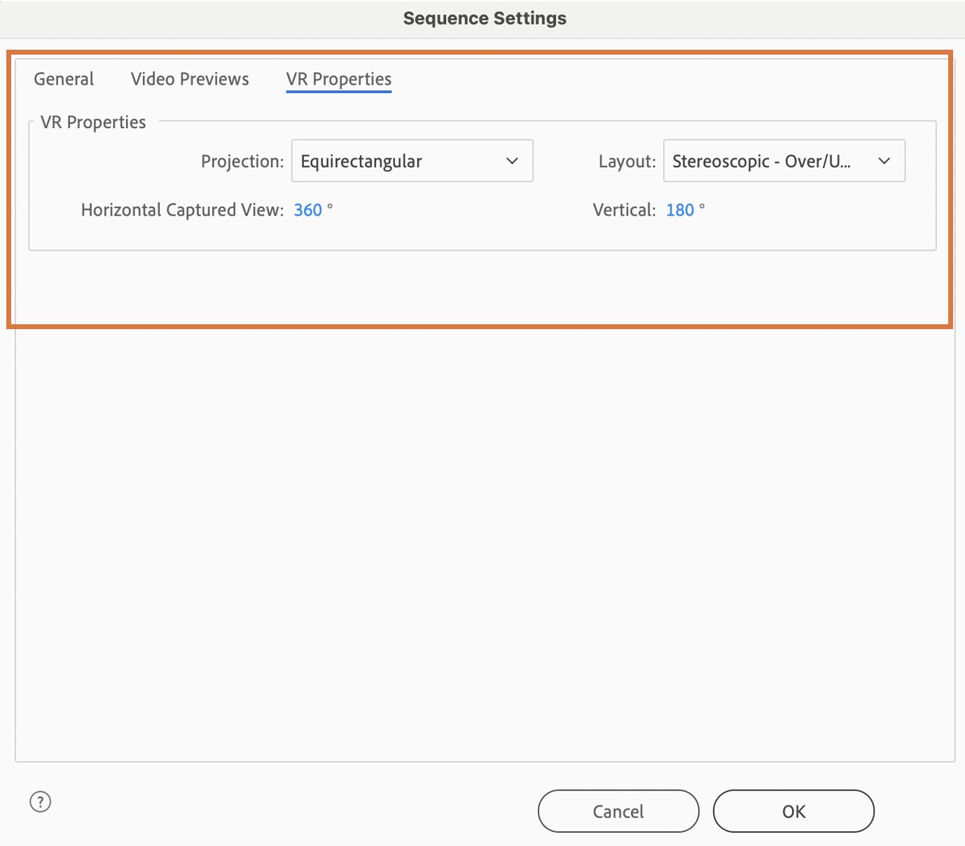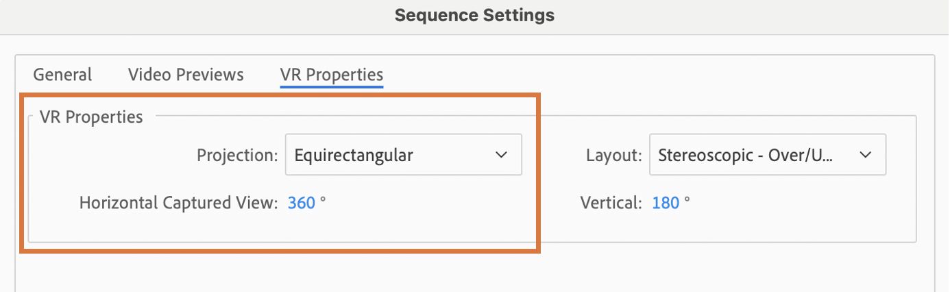 To determine if a sequence has VR properties assigned to it, select the Sequence Settings option from the Edit menu when the clip is open in the Timeline panel. The Source and Program Monitor Settings options for VR Video remain disabled when a sequence that does not have VR properties is viewed.