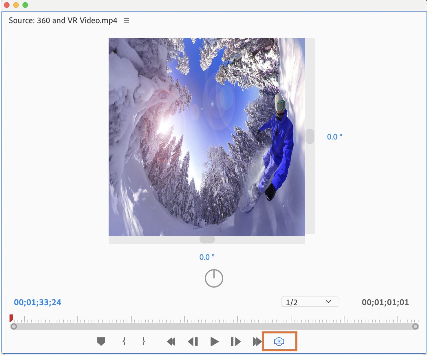 To turn off the controls in the Source Monitor, simply click on the Toggle VR Video Display icon.