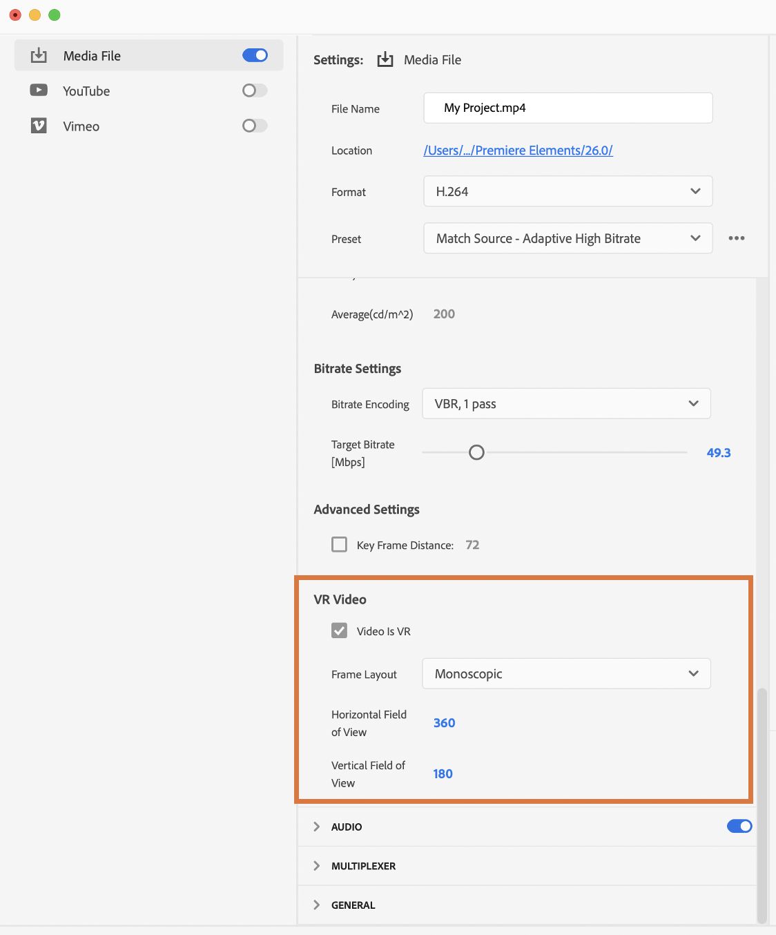 When exporting VR projects, Premiere Elements automatically applies the VR properties of your clips and sequences. These settings ensure that the output retains the correct projection, layout, and viewing experience.