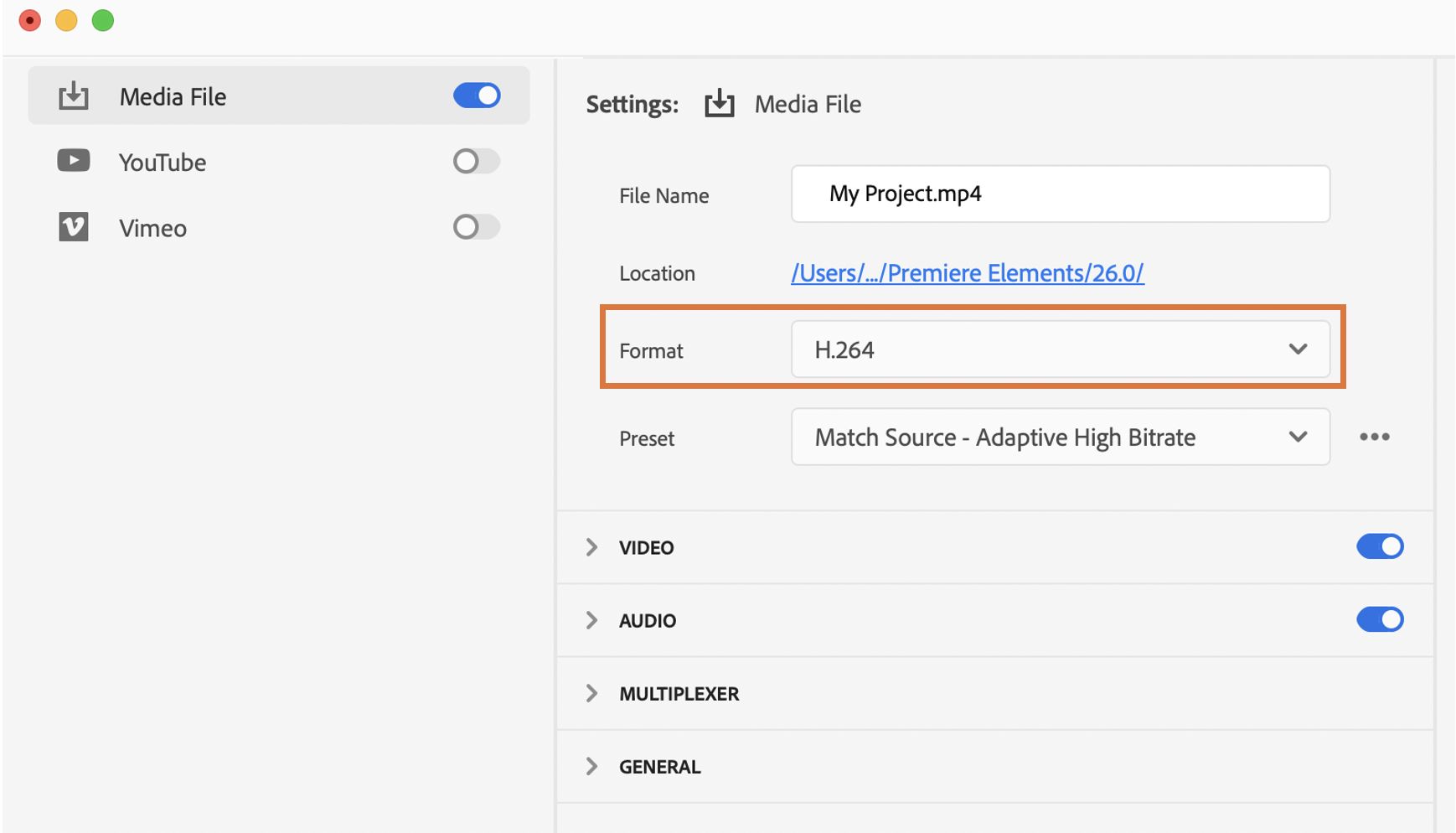 Once selected, the Audio in Tracks settings will automatically update to Multichannel Mix and Adaptive Track Type.