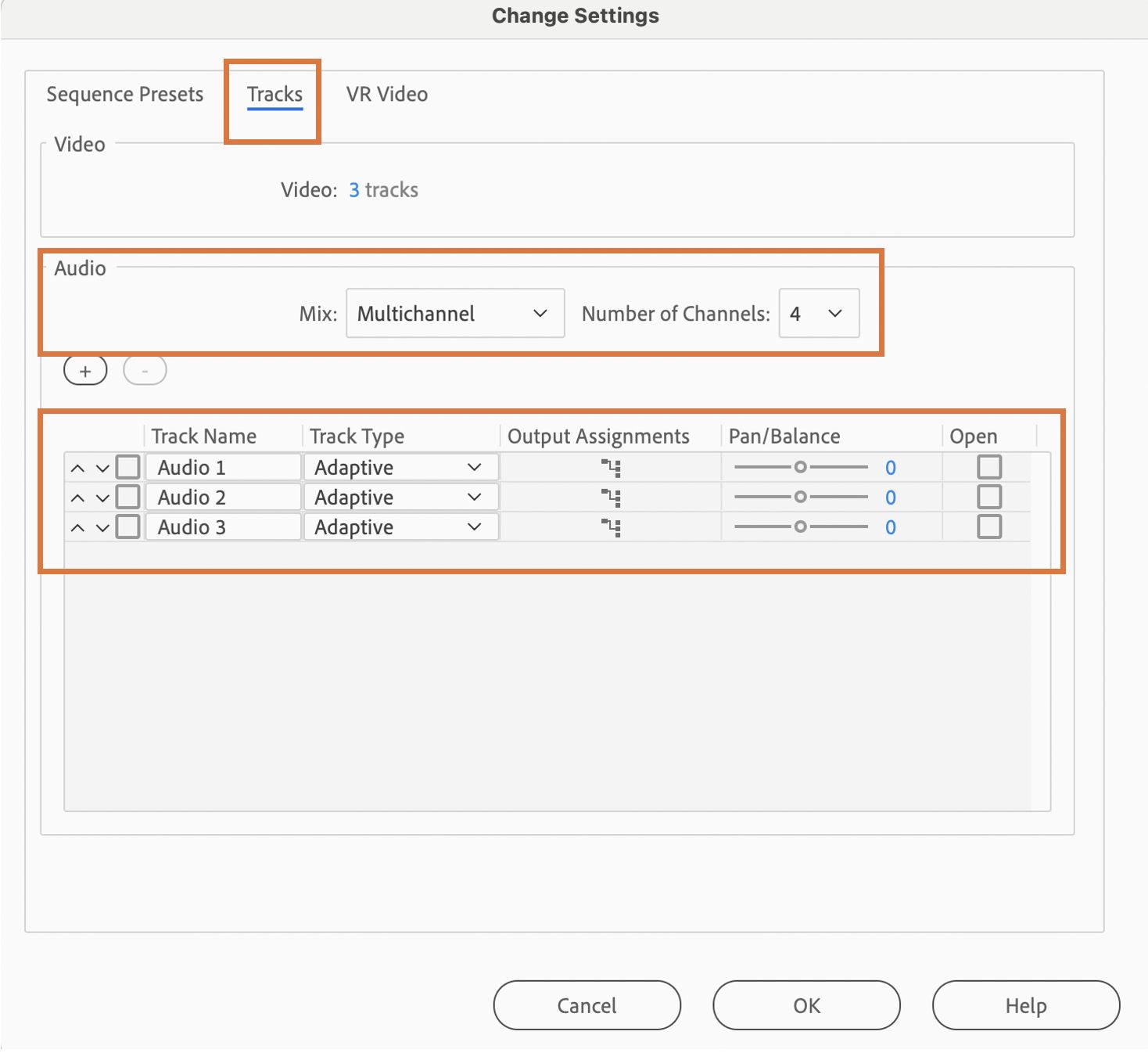 When you select an Ambisonics preset under VR in Sequence Presets, the Audio in Tracks settings automatically update: