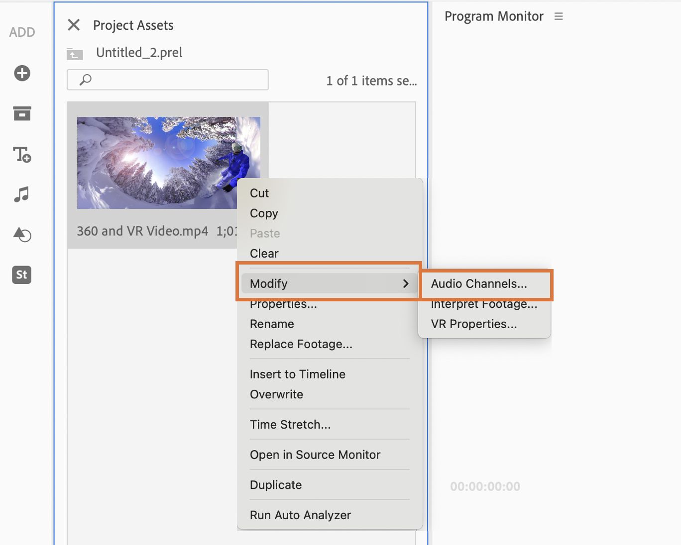 In the Project Assets panel, right-click on the clip and select Modify > Audio Channels.