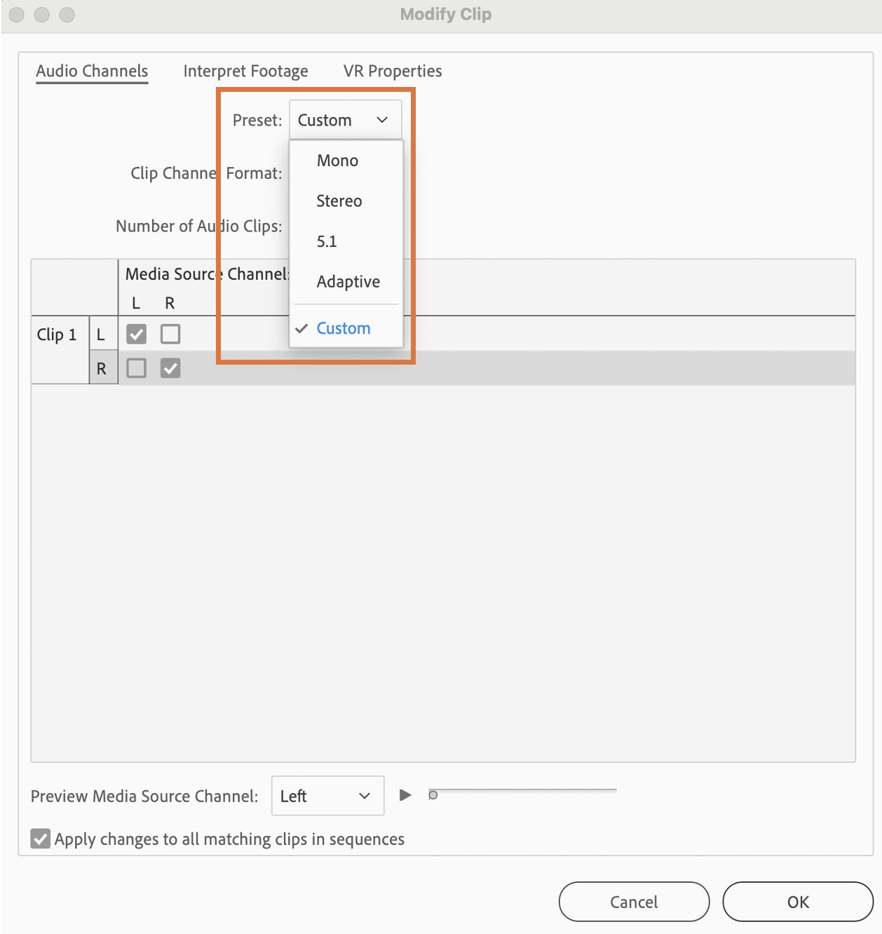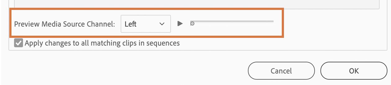 You can set the Preview Media Source Channel to Left or Right using the dropdown arrow.